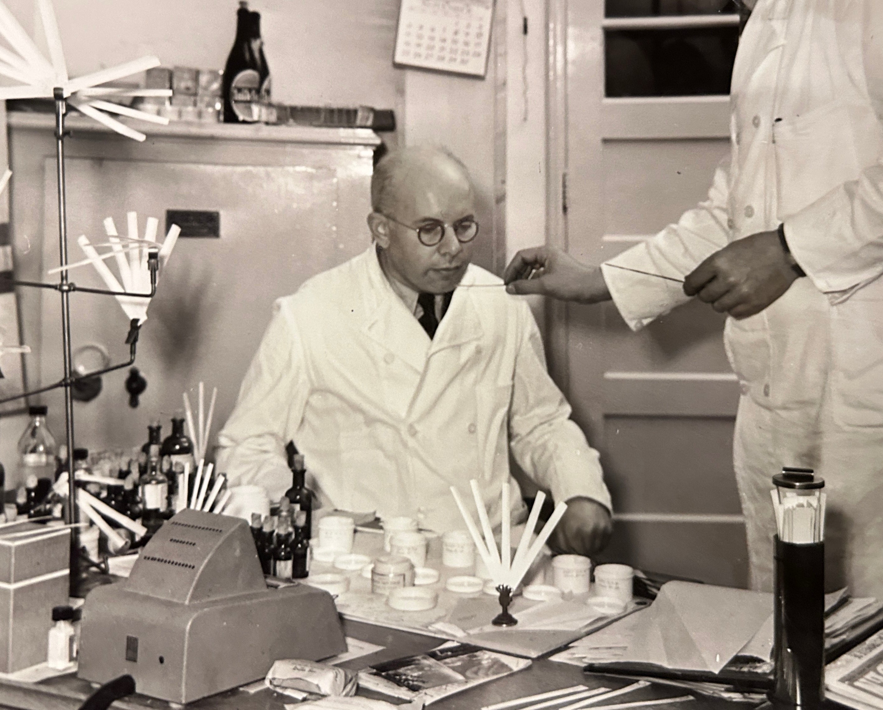 Piet Kos (1904–1971) at 13 began working in a perfumery factory. By 1927, he had taught himself the art of perfumery while working for Chemische Fabriek Naarden, which later became part of Givaudan. Known for his dedication and talent, he won numerous industry awards. During World War II, he was active in the resistance, risking his life to distribute food and false identities. Despite retiring, he continued consulting for the company until his death in 1971. Piet never married but left a lasting legacy in perfumery.